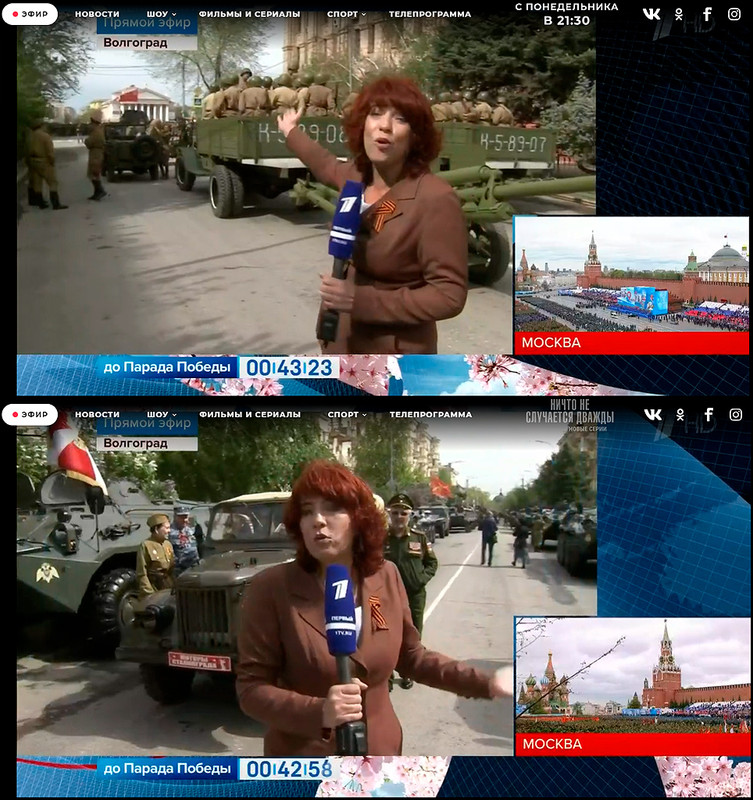 Показали город-герой на Волге. Репортаж вела Елена Пич которой как-то удалось взять у меня пару слов на камеру. На первом кадре видим въезд на площадь павших борцов, где проходит парад. На втором кадре в золотом сечении видим купол Волгоградского планетария.