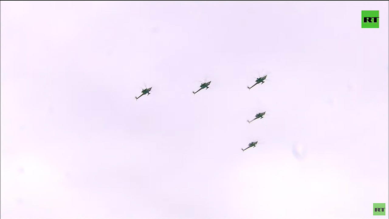 Пилотажная группа Беркуты на хороших, годных вертолётах Ми-28. Жаль, не показали детально.