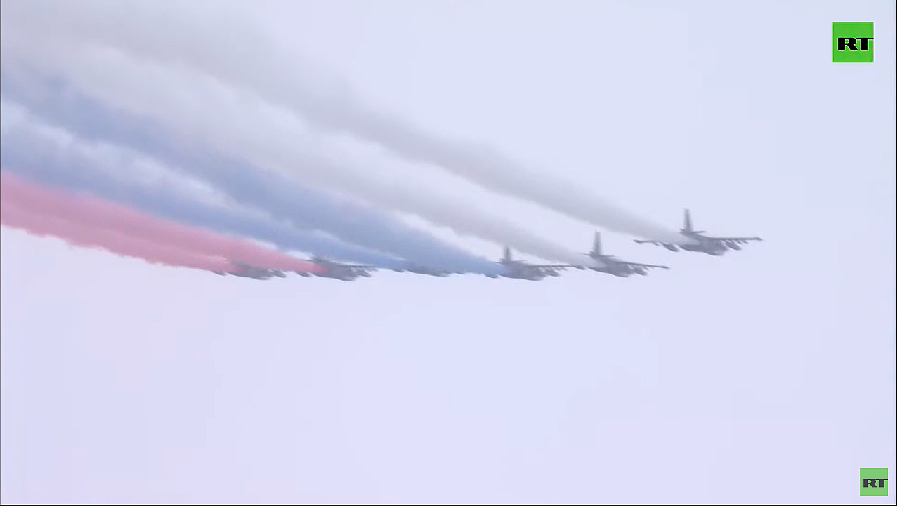 Замыкают авиапарад традиционно Грачи с распылением дымов, образующих цвета государственного флага России.