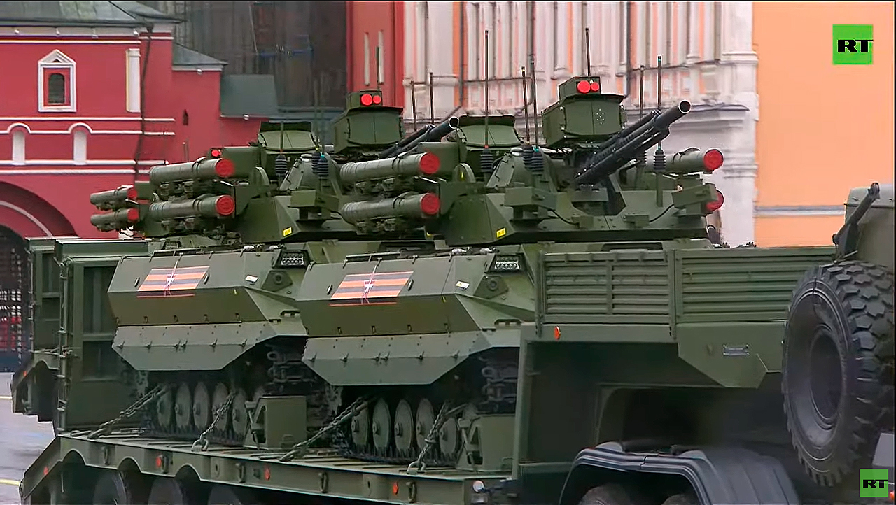 Робототехника Уран-9 как и на парадах ранее проходила по площади на трейлерах.