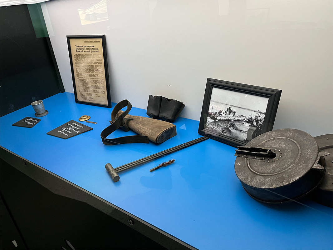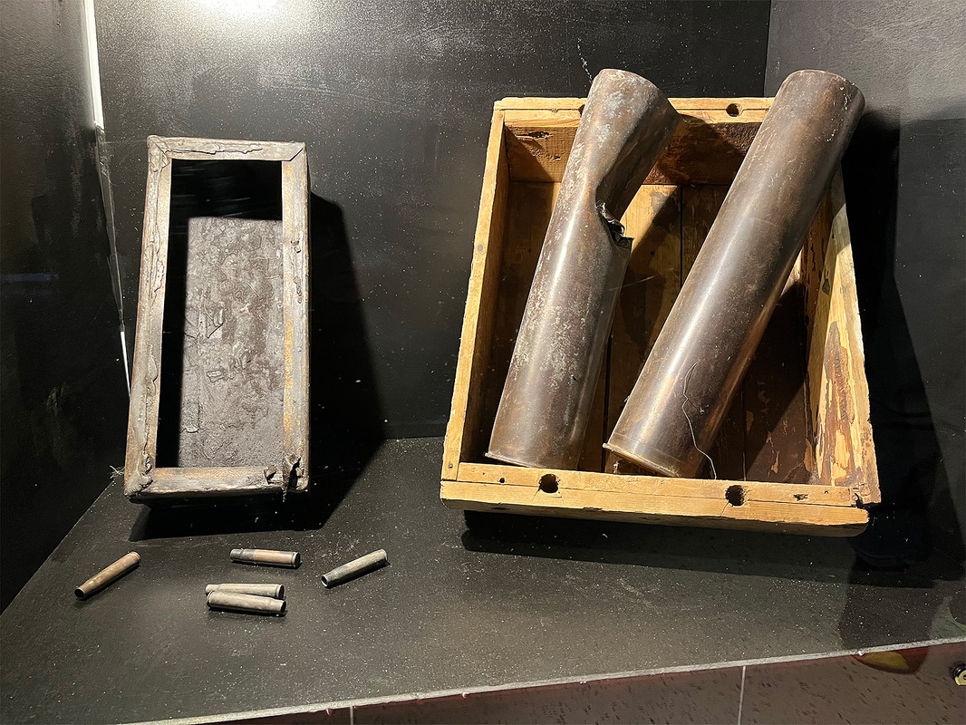 На этой витрине видим пустой отечественный цинковый ящик от патронов, гильзы от западенских патронов, которые в таких ящиках не хранились, а так же гильзы от 76-мм снарядов к танковой пушке, входившей в комплекс вооружения бронекатера. Что по штату хранилось в деревянном ящике -- не в куrсе.
