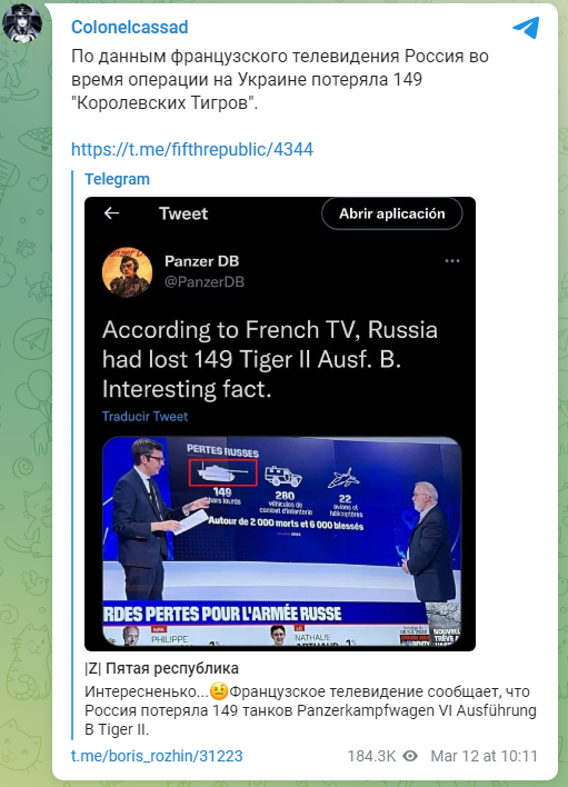 Тем временем, французские девочки-дизайнеры доводят до общественности западноевропейской сверхдержавы, что Россия потеряла кучу своих Тигров 2 и пачку Ф-16! Хорошо, хоть не Леклерков :о) https://t.me/boris_rozhin/31223