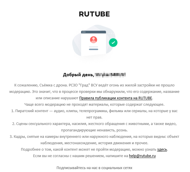 По поводу работы отечественной платформы для публикации видеозаписей. Не прошло и недели, как прекрасный RuTube отклонил вот это видео к публикации, о чём любезно сообщил письмом: