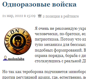 Ещё одно выступление от molonlabe На сей раз -- на тему участия в рядах терробороны Украины.