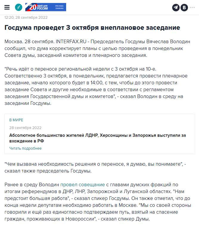 На 3 октября назначено внеплановое заседание Госдумы по вопросам, связанным с новыми территориями.